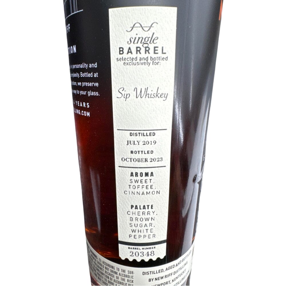 Introducing the New Riff X Sip Whiskey Single Barrel Select, a meticulously crafted and exclusive whiskey experience. Distilled in July 2019 and bottled in October 2023, this exceptional spirit embodies the artistry of New Riff Distilling. The aroma is a delightful blend of sweet toffee and cinnamon, setting the stage for a sensory journey. On the palate, savor the rich notes of cherry, complemented by hints of brown sugar and a touch of white pepper, delivering a harmonious and complex flavor profile. This unique expression, Barrel Number 20348, has been handpicked and bottled exclusively for Sip Whiskey, ensuring a one-of-a-kind tasting experience for discerning connoisseurs.