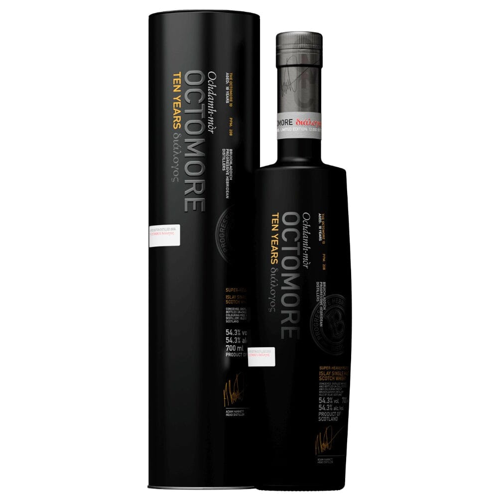 Octomore 10 Year Old 4th Edition is a super-heavily peated Islay Single Malt Scotch Whiskey that has been conceived, distilled, matured and bottled un-chill filtered and coloring free at Bruichladdich Distillery. Ocotomore 10 Year Old 4th Edition was distilled in 2009 and aged for 10 years with a PPM of 208 and bottled at 54.3%