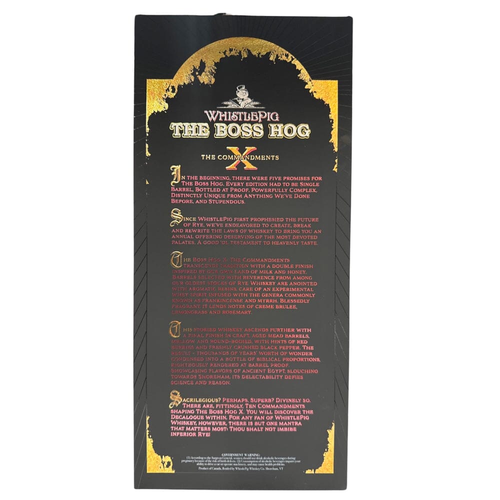 Experience the unmatched excellence of WhistlePig The Boss Hog The Commandments Straight Rye Whiskey. Crafted in Canada and finished in craft mead and aromatic resin barrels on our farm, this limited-edition spirit offers an unparalleled taste. Each bottle is meticulously hand-bottled, ensuring the utmost precision and care in every drop. Indulge in the velvety texture and mesmerizing flavors that make this whiskey truly extraordinary. Elevate your whiskey collection with The Boss Hog, a testament to our commitment to quality and craftsmanship.