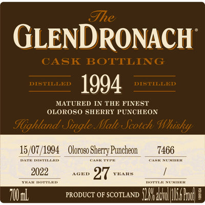 Glendronach 27 Year Old 1994 Cask #7466 Single Malt Scotch Whisky 700ml