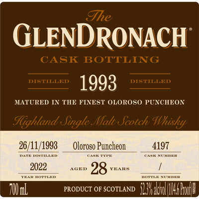 Glendronach 28 Year Old 1993 Cask #4197 Single Malt Scotch Whisky 700ml