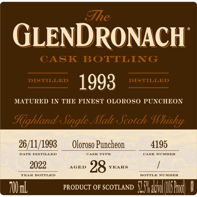 Glendronach 28 Year Old 1993 Cask #4195 Single Malt Scotch Whisky 700ml